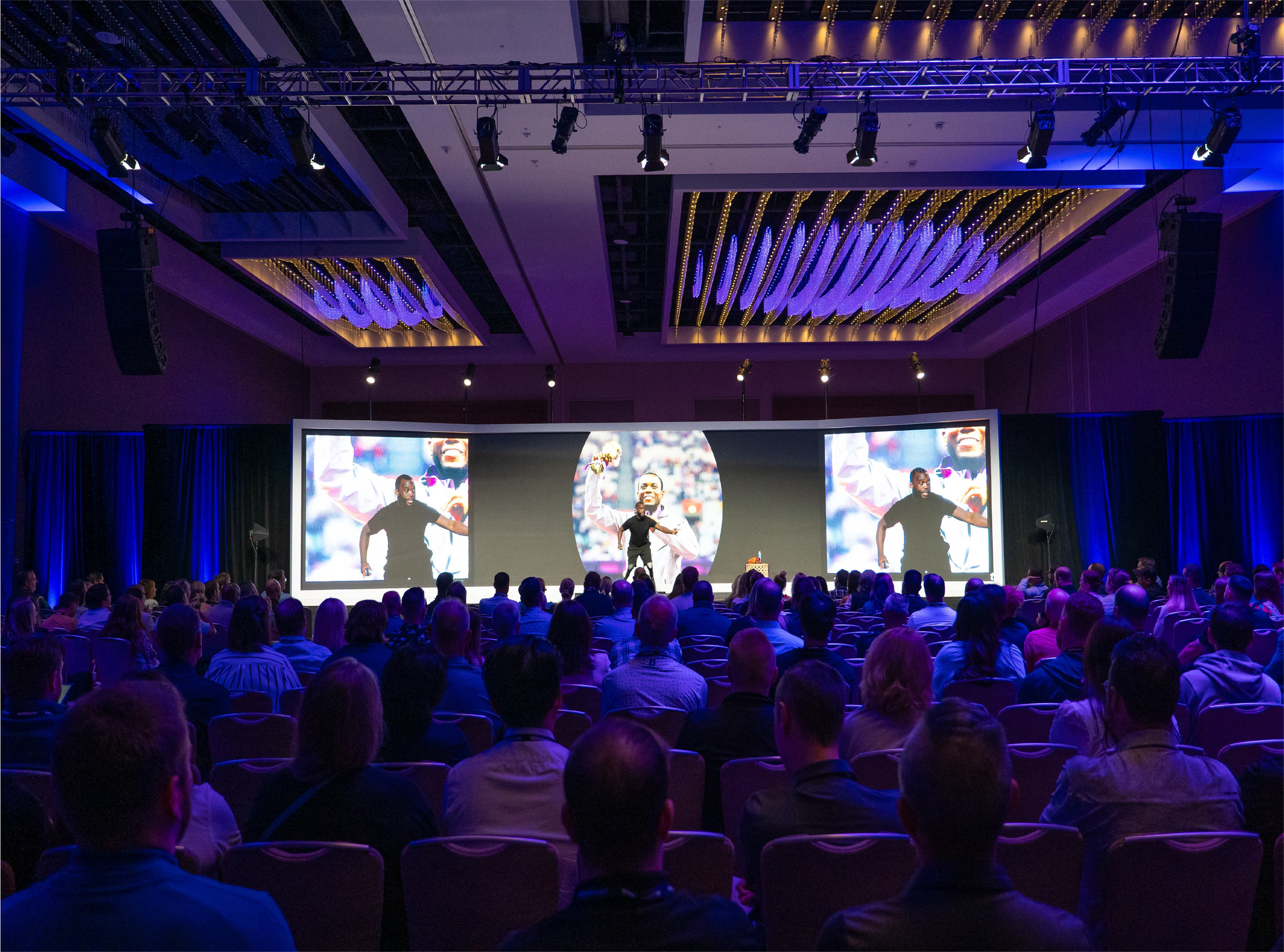 Logo, environmental design, stage branding, swag, and digital assets deployed across a multi-day conference with 500+ attendees from professional sports clients and global ticketing partners.